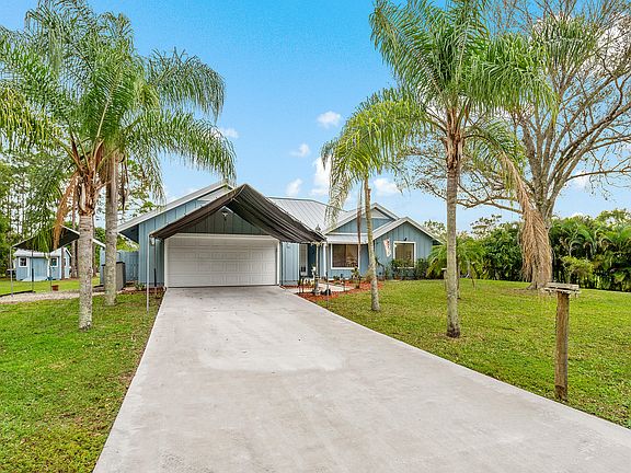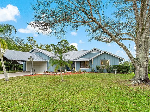 Discover the perfect blend of tranquility and convenience in this Jupiter Farms gem. Situated on 1.15 acres of lush landscape, this 4-bed, 2-bath haven offers a fenced corner lot, ideal for farm animals or for all your toys. The property offers a permitted utility shed, freshly painted exterior, storm shutters for all openings, security spot lights and sensor, and a new metal roof. Enjoy the refreshing screened in pool, split bedroom plan, stainless steel appliances, fruit trees and the small pond, creating a harmonious blend of comfort and nature. the home will convey with an additional refrigerator. Your dream home awaits.