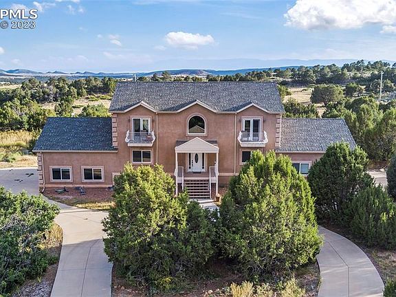 Privacy abounds on this 5-acre parcel just 15 minutes south of Colorado Springs. This 2-story stucco stands at the top of a teardrop driveway amongst natural landscaping dotted with mature trees. Enter to the dramatic, "Hollywood" stair case at the main level. Formal dining to your left, formal living with gas fireplace to the right. Completely remodeled kitchen is a true chef's dream. More drawers than you could ever need. Huge, butcher block island, dedicated pantry, granite counters and gas range! Just off the kitchen is the first 3-car garage. Laundry, full bath and bedroom complete the main level. Access back yard via main level laundry. A second 3-car garage can be accessed through door in the main level bedroom. Upstairs, the primary suite features a balcony, 2-sided gas fireplace, 5-piece bath and walk in closet. Primary bath has radiant floor heat. On the opposite side, upper level are two more oversize bedrooms and a dedicated, full bath. A second, upper balcony is dedicated to bedroom 2. Don't miss the laundry chute for convenience and fun! Newer, LVP flooring on entire upper level. The basement is home to the 5th bedroom, 4th bath and huge family room. Additional storage and utility rooms won't leave you wanting for space. Two, newer Tuff Sheds outside provide room for anything and everything. Parts of this acreage have been used for gardening and could be resumed. Seller believes basement square foot is reported incorrectly on Public Records. It appears to be similar to the main level footprint (1581 square feet).