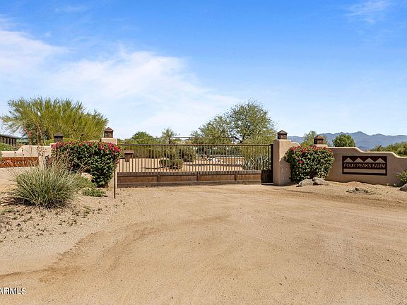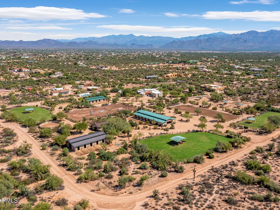 RARE opportunity to own one of the nicest equestrian properties in Scottsdale. Four Peaks Farm is a classic 9 acre horse ranch that invokes a sense of peace & serenity & borders McDowell Mtn Regional Park w/access to 21,099 acres of non-motor vehicle trails. Facility showcases a lighted arena (200'x100'), arena (200'x70'), round pen & 3 MD Breezeway barns; totaling 26 stalls each featuring 20' runs. Main barn has climate controlled lounge, bathroom & tack room. 4 stall mare motel, 3 large grass pastures, 3 large turnouts w/shade structures & (2 bed/1.5 bath) guest house/manager's residence w/fenced yard. Main home has 2 master suites, den/office, casita, 3 car oversized garage & a resort style backyard complete with a balcony, pool & spa. 2 GREAT wells. See the Documents tab for more info