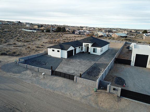 Welcome to this stunning custom new build in the heart of Rio Rancho, offering breathtaking mountain views and modern luxury. This move-in-ready single-family home spans 3,100 sq. ft. with five bedrooms and four bathrooms, designed for both comfort and style. Situated on a half-acre lot, the home features RV parking and backyard access, a beautifully xeriscaped front yard, a block wall entry with a sleek metal gate, and an eye-catching glass-and-steel front door that sets the tone for its contemporary design.Inside, the open-concept layout is enhanced by marble tile flooring, clean modern finishes, and a seamless flow to the outdoors through a large sliding door that leads to a custom stamped concrete patio. The gourmet kitchen is a chef's dream, boasting quartz countertops, a