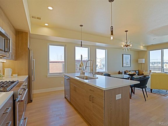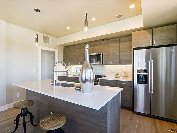 This END UNIT townhome has a price tag of a middle unit! This unit has great mountain views to the west from the rooftop deck that supports a hot tub. This Kitchen is finished with Stainless Steel appliances and Quartz countertops and also features a large kitchen island that opens up to a spacious dining area and great room. There are hardwood floors throughout out main level and the bathrooms feature trendy finishes and tiles as well. An oversized 1.5 car garage (15 feet wide) complete this awesome townhome! Literally steps away from the $370 Million development starting soon at the south end of Broncos stadium that will have new retail and commercial spaces. As of May 30th, unit is being painted and should be done by June 15th. Easy to show! (Pics are of a similar unit with the same finishes)