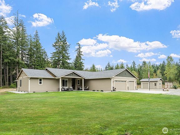 Beautiful open concept rambler on 5 flat acres surrounded by nature. Your own retreat featuring a covered built-in outdoor kitchen space, hot tub, fire pit and wood storage, fenced garden space, play area, and additional storage shed with roll up garage door. You'll find everything you need with a generator, heat pump (air conditioning), propane tank, and 1000+ sqft temperature controlled attached garage. Large kitchen with eat-in dining that opens up to the main living space and wood stove. The primary suite features an oversized bathroom and walk-in closet, with 2 additional bedrooms and a large office with French doors. Just minutes from Lake Lawrence.
