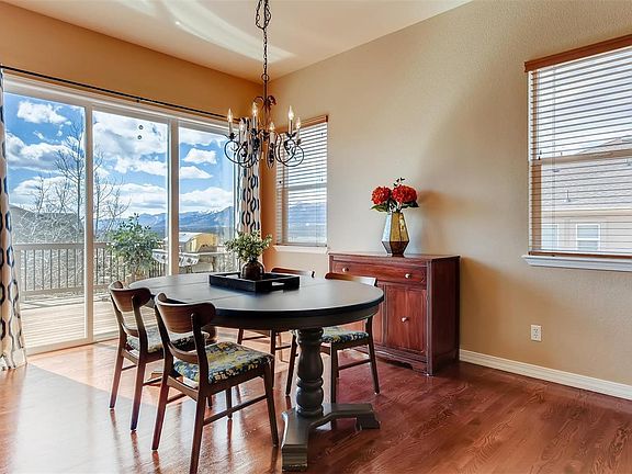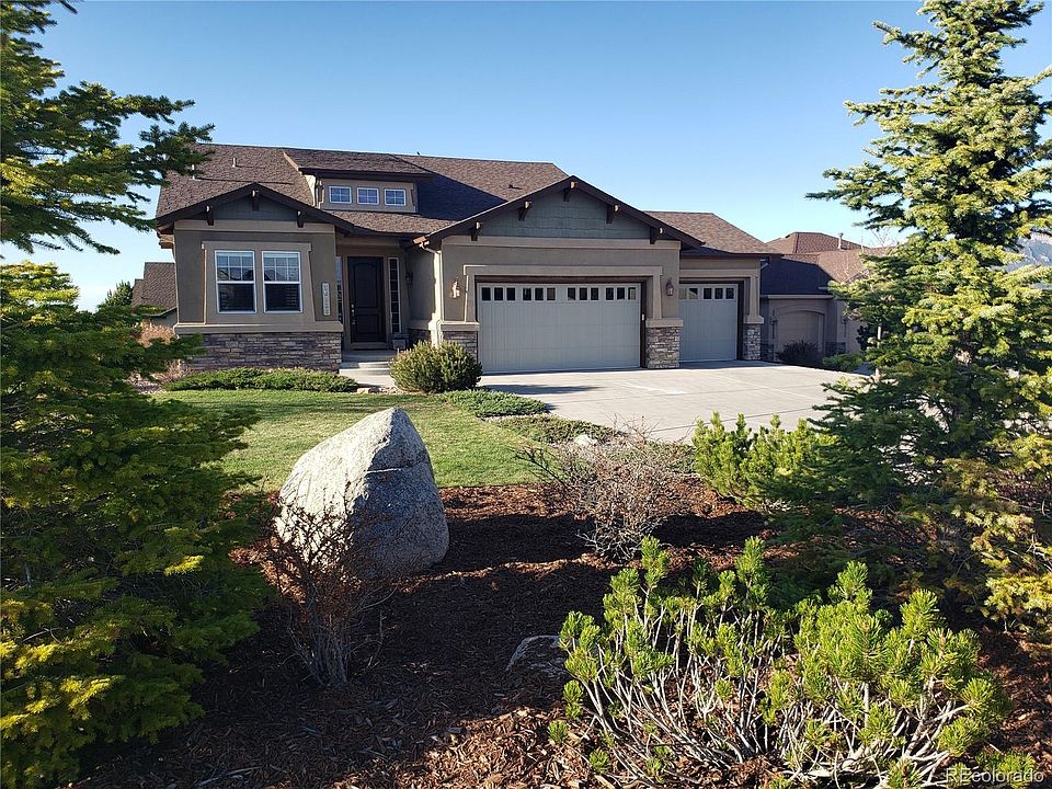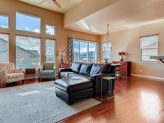 Gorgeous ranch walk out home with incredible mountain views! Spacious and TRUE MAIN LEVEL LIVING has gleaming hardwood floors throughout entry, kitchen, & great room. Master suite has an attached 5-piece master spa w/soaking tub, his and hers sinks with quartz vanities, custom tile shower, & large walk-in closet with natural light. Incredible kitchen w/ granite counters, upgraded 42" cabinets, island, & counter bar. Large secondary bedroom on main - could also serve as home office. Walkout basement includes wet bar & family/rec room. Enjoy the amazing theater room with tiered floor and surround sound. Back room currently used as workout room could also be extra storage. 2 spacious secondary bedrooms on basement level. Basement bath includes custom slate tile and upgraded plumbing and lighting fixtures. Basement walks out to large concrete patio, perfect for enjoying the views. 9 FOOT basement ceilings, upgraded lighting fixtures throughout, custom wood blinds, central vac, & large main level laundry with storage and cubby closet. 3 car garage includes natural light and extra storage cabinets. LOVE TO ENTERTAIN and take in Pikes Peak on expansive 28' x 12' COMPOSITE deck plumbed with gas line for your grill! Established, easy-care, professional landscaping. Cul-de-sac location! Close to AFA, I-25 (commute to Denver or COS), award winning D-38 schools, trails, parks, and shopping. Don't miss this incredible home!