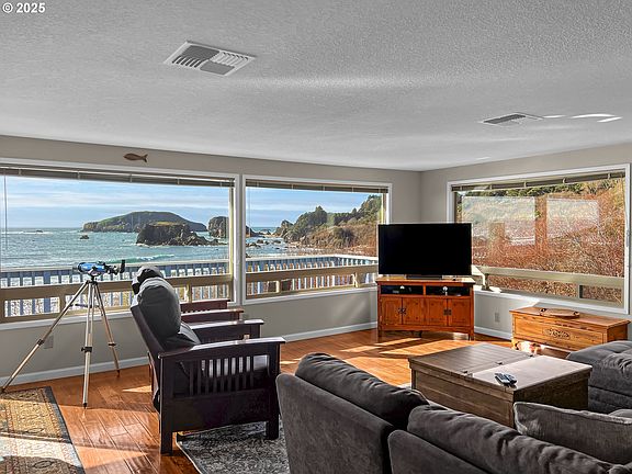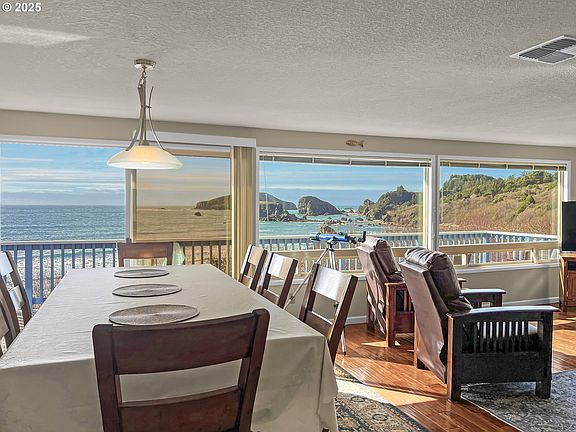 Welcome to your Mid-Century modern oasis by the sea! This stunning 4 bedroom, 3 bath beach home offers a perfect blend of coastal living and timeless design, perched above the sandy shores of Harris Beach State Park. With easy beach access just steps away, this residence promises an unparalleled seaside lifestyle. The outdoor shower allows you to embrace the carefree beach lifestyle, ensuring a seamless transition from the sandy shores to the comfort of your home. The main level features 3 bedrooms and 2 baths, seamlessly integrating modern comfort with a touch of retro charm. The great room boasts walls of windows, bathing the interior in natural light and framing breathtaking ocean views. In the living room, custom cabinets add a touch of sophistication, while the kitchen is a chef's dream with stainless steel appliances, granite counters, and an abundance of custom cabinets surrounding a convenient island. The dining area opens up to a spacious deck, providing an ideal spot to soak in the coastal scenery and observe the local wildlife. Imagine sipping your morning coffee with the sound of the waves as your backdrop or enjoying a sunset dinner with friends and family.Venture downstairs to discover a versatile space with 1 bedroom, 1 bath, and the beginnings of a kitchen. This lower level, complete with a living room and game room, opens onto a delightful patio, seamlessly connecting indoor and outdoor living. The layout allows for potential dual living, making it an excellent option for a two-family setup. Currently operating as a successful vacation rental, this fully furnished home invites you to walk barefoot on the sandy beach, witness stunning sunsets, and revel in the drama of coastal storms. Located close to town, convenience meets tranquility in this Mid-Century modern beach retreat. Your dream coastal lifestyle awaits! Close to hiking and biking trails, Brookings, restaurants and shopping.