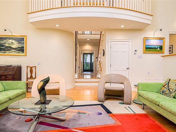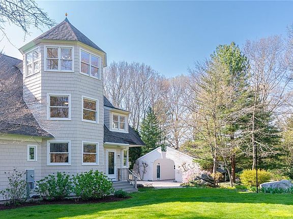 Tucked into a beautifully landscaped 8-acre lot in sought after Saunderstown, and designed by award- winning architect Oliver Cope, this Nantucket Shingle-Style inspired contemporary home embodies style, grace and comfort. As you travel down the winding driveway, 2 detached garages with whimsical arches frame the gracious front courtyard and welcoming entry. Inside, the rooms are spacious, with high ceilings, warm wood flooring and fantastic light. A first-floor master suite, one of 2, occupies the northern front corner complete with large spa bath and generous built-in cabinetry. A home built for entertaining, the well-appointed kitchen with sparkling green granite flows into the dining and living area with soaring ceilings, custom windows and dramatic balcony. A screened terrace runs along the entire back of the house, offering additional entertaining space. The second floor offers another master suite, 3rd bedroom and bathroom and study. Stairs to the 3rd floor octagonal tower room lead past multi-story windows with pretty views and into a space that is truly delightful, inspiring all kinds if uses. Meticulously maintained, this special property offers a very comfortable and livable home in a storybook setting. Matterport virtual tour and exterior video attached. Close to Newport & Narragansett beaches, 15 min to TF Green, easy commute to URI or Providence. RR zoning allows for sub-division potential for family compound and/or accessory dwelling.