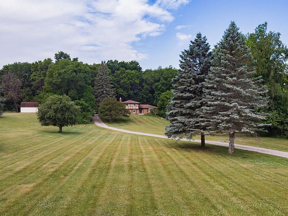 This property is a must see! Peaceful country setting on a beautiful 3.55 rolling acres in the charming town of Milford. This 4 bedroom, 2.1 bath home is nestled into a landscape of vast lawn & mature trees with regular wildlife visits, providing a serene private setting. The property features a long driveway off the road, a personal mountain bike track within the wooded backyard, a back deck & brick patio, perfect for relaxing & viewing nature. This home has a nice open flow between the spacious kitchen with vinyl plank flooring & ample storage to the large family room with wood paneling, wooden beams, natural brick fireplace & hardwood flooring. Both spaces great for entertaining. Additional living room & formal dining area. Lots of windows throughout providing great views & natural light. Sizable master suite with tons of closet space & a nicely updated bath which includes granite sink top, large tile shower with glass doors & custom lights. Additional bedrooms bright & neutral with good natural light, as well as a room for an office or den. Large walkout basement with day light windows, lots of opportunity for some finishing touches to make a great extra living/entertaining space. Whole house water filters, large 75 gallon water tank, new garage door opener. With some TLC & personal style touches this home is sure to be your perfect country retreat! Please view drone tour.