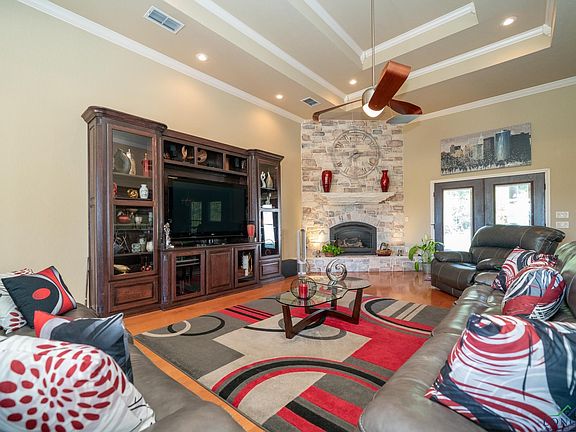 This Modern-Contemporary custom-built home sitting off the road for privacy is on 13.365 acres in White Oak. This one owner home has been well maintained and is move in ready. The home offers a spacious living/dining combo open to the kitchen and breakfast area. Kitchen includes stainless steel appliances, double dishwashers, large double door refrigerator, granite counter tops, island with sink, walk in pantry, soft close drawers, with lots of cabinet and countertop space. There are many extra features in this home including unique fixtures, ceiling fans, hardwood floors, high trey ceilings with crown molding, built in entertainment center in living area, built in bookcase in office, and stone propane fireplace. Split bedrooms with oversized primary bedroom, walk in closet, with en suite bathroom featuring double vanities, walk in shower, and jacuzzi bathtub. Large guest rooms with adjoining bath. Outside additions include a breezeway between main house and garage for additional covered parking. Multi purpose 400 sq ft space with its own air conditioning/heating and bath. There is also a shop on the property that is not finished out and is in need of repairs. This property has lots of space and is ready for a new family to make it their own.