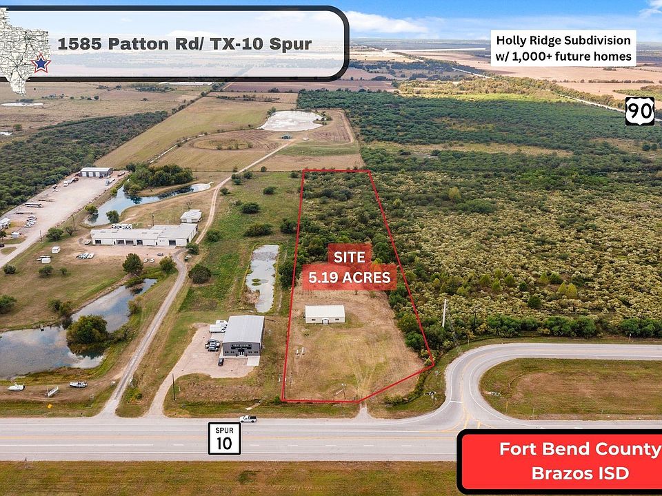 Welcome to 1585 Patton Rd/ TX-10 Spur, Rosenberg, TX 77471! Excellent commercial opportunity on 5.193 acres in a rapidly growing area! The front portion of the property is cleared and ready for development, while the back offers a beautiful natural setting. A 2,400 sq. ft. steel frame building on-site features a large open interior, bar area, bathrooms, office, and storage space—perfect for a wide range of business uses or future redevelopment. Located just off Hwy 90, this property offers quick and easy access to Rosenberg, Richmond, and Sugar Land, and is conveniently close to the new Holly Ridge Subdivision on Hwy 90 featuring over 1,000 homes to be built. With its combination of usable structures, open land, and prime location, this property offers outstanding potential for investors, business owners, or developers.