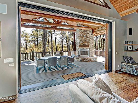 Beautifully crafted 3000 sq ft single level, mountain lodge style home in the highly desirable and gated High Valley Ranch community just 4.1 miles from downtown Prescott. Bordering the national forest provides access to dozens of hiking trails and the beauty of the forest right outside your door. Floor to ceiling sliding glass walls from the great room to the covered deck provide spectacular indoor/outdoor space. Two magnificent inside and outside stone fireplaces create the perfect ambiance while enjoying the forest and its wildlife on a chilly afternoon or just relaxing in front of a roaring fire in the living room. Split plan with three en-suite bedrooms make this a perfect home for hosting guests while maintaining a private master suite. Chef quality stainless appliances provide the
