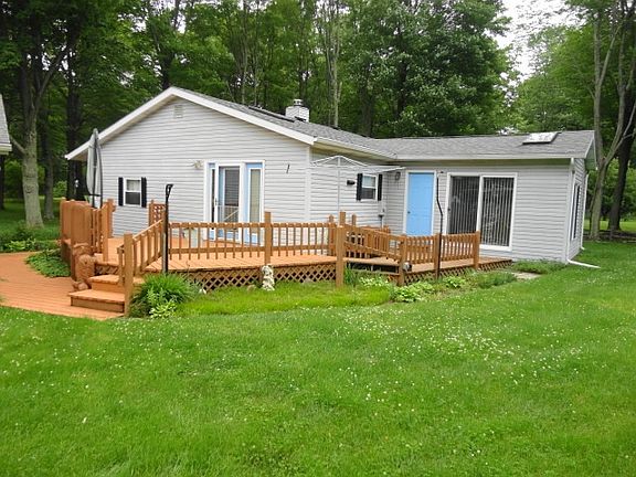 Spacious 2 bedroom, 2 bath home with large, eat-in kitchen that has skylight and breakfast bar facing huge living room that has a wood burner and a bay window overlooking large front yard. 2 more skylights in the back bedroom gives great light and a slider to the back deck looking out at giant, partially fenced back yard. There's about 500 sq. ft. of decking to enjoy the outdoors, and nearly 9/10 acre that gives you a country feel and privacy. There's an oversized 2 car garage with workshop and a storage shed. All this at the edge of town and close to amenities and shopping.