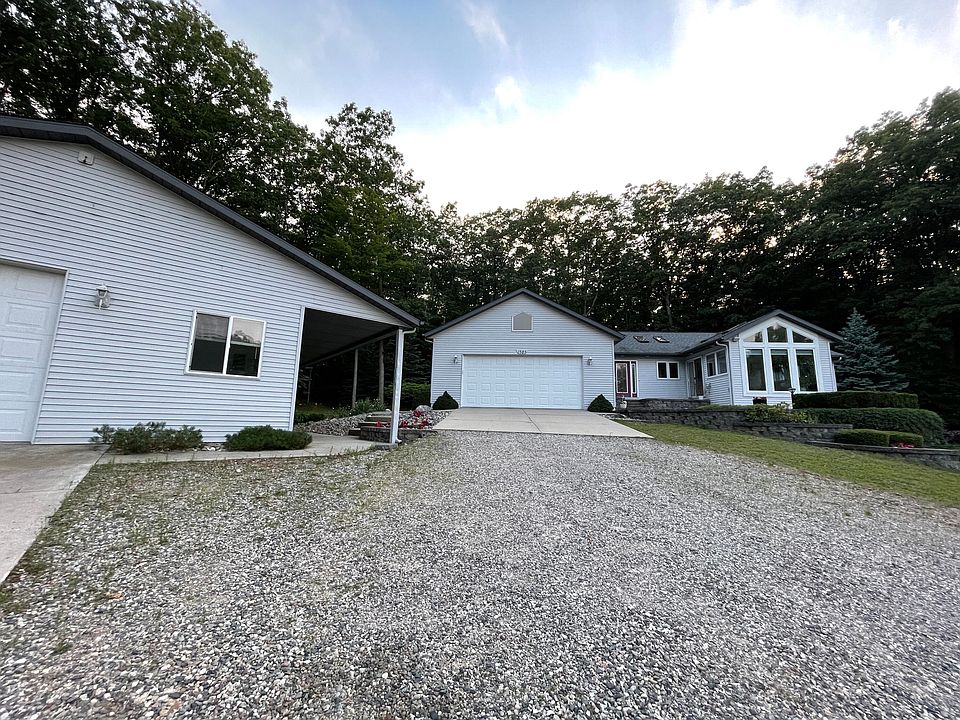 The perfect location for this custom built home on 3.73 Acres. This hillside offers a view of the lake, while the home has a beautiful open floor plan. 4 bedrooms, 3 full baths, full finished basement, central heat and air. From the large open kitchen with quartz countertops, relax in the sunroom, large master with full bath to relax in the jet tub, 2 gas log FP, main floor laundry. Once you step downstairs you will love the family room and bar area, office space, workout room, room for the man to get away and plenty of storage. Attached finished garage, 30x40 insulated and finished garage with office, half bath still needs hook up, 10 x40 covered area, large front patio, back patio overlooking landscaped yard with waterfall feature, 3 season gazebo with lake views. Backs to State Land.