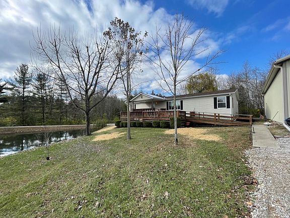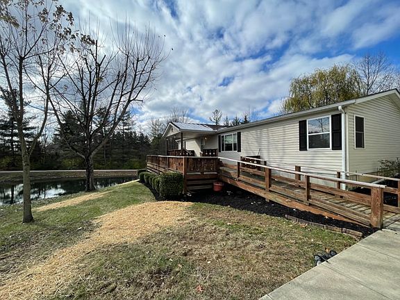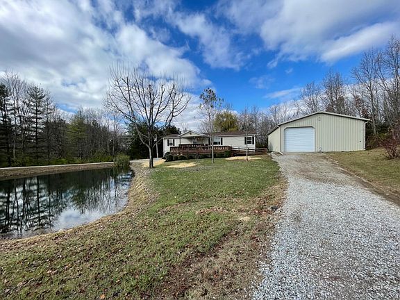 Sweet seclusion! Ranch with finished walk-out basement on 2 pretty acres. Stocked pond. 30x 48 pole barn with 12 ft. door large enough for boat or RV. Open great room/kitchen area with large island, split floor plan with master on suite. Lower lever with bar area and large oversized 2 car garage. Big front deck overlooking pond, nice back deck overlooking yard and garden area. Circular driveway. Well maintained. 20 min. from Aurora.