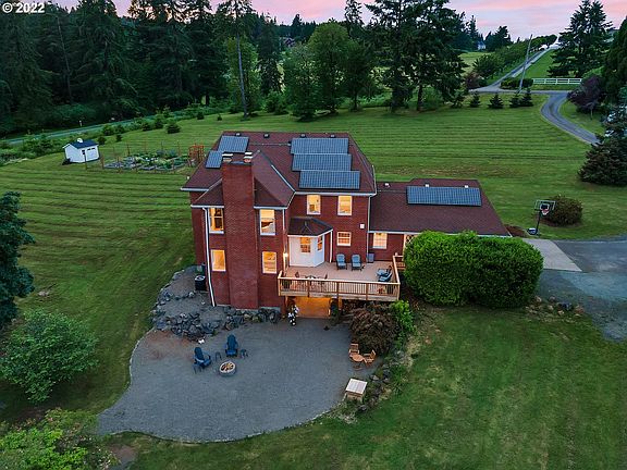 A dream home on Parrett Mountain! Nearly 5 verdant acres w/ evergreens on 3 sides, a fenced garden with raised beds, fruit trees & more. The home features 4 upstairs bedrooms, w/ formal living, dining, and family rooms on the main. Head downstairs to the completely remodeled basement featuring a full kitchen, 2nd fireplace, sauna, patio access & more! Dual or multi-generational living potential on this stunning property, just a few minutes from both Sherwood & Wilsonville! New appliances!