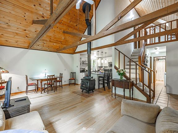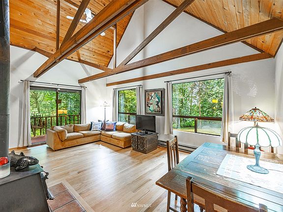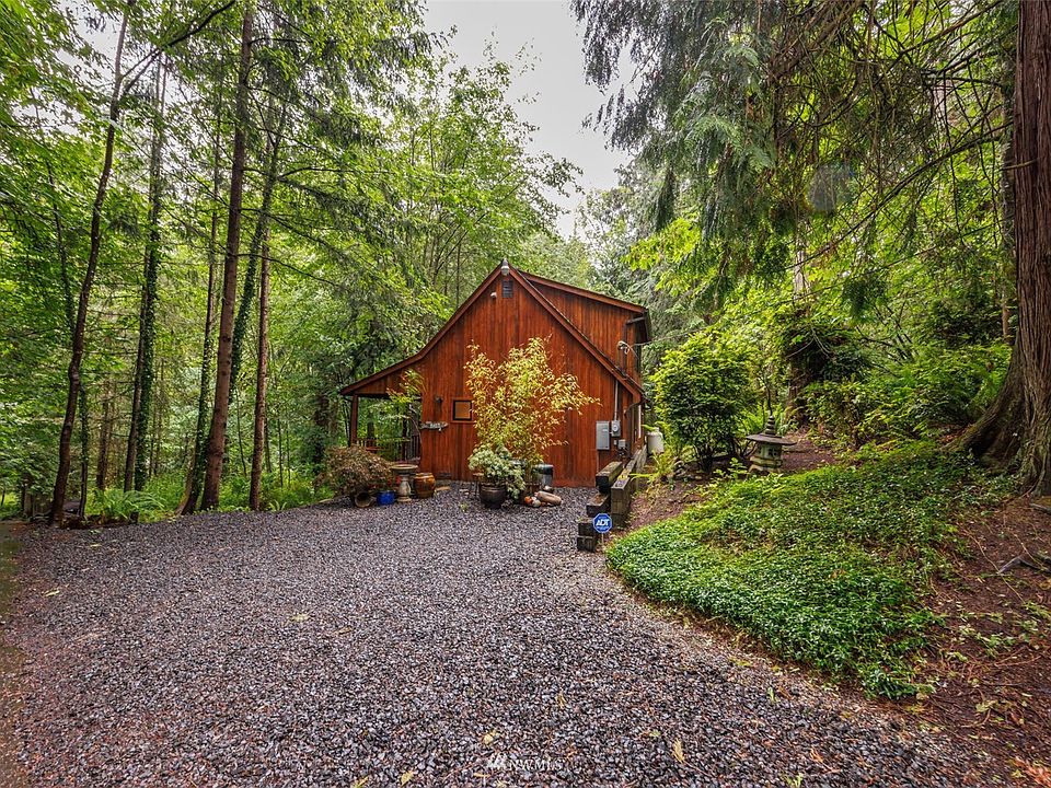 You'll be delighted by this very special home situated for privacy on 1.72 tree covered park-like acres You'll love the large covered porch w/log elements & there's a beach access easement that's an easy hike on a private black-top road through the forest to a well maintained trail & only 9 steps to the beach. Upon entering the home, you'll feel embraced by the exposed wood beams, T&G ceiling & nurturing verdant views from every window. Beautifully updated kitchen w/newer SS Appliances & Granite Counter tops. The primary bedrm is on the main-floor, along w/full bath & room for a stacked W/D. During the Summer, open the slider & get the natural cool forest breeze circulating through your home. Upstairs are 2 bdrms, bathrm & reading nook.