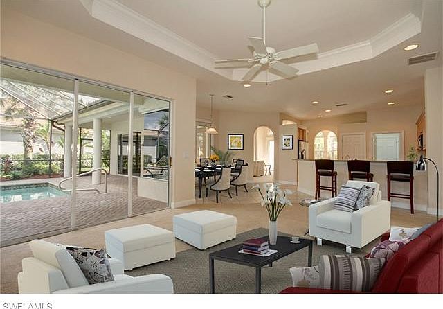 Beautiful 4 bedroom, 3 bath home with 2 car garage, built 2004. Terreno model in great North Naples community. Lake front, 2018 hurricane impact doors and windows, pool and spa with remote controls, covered lanai, living room, family room, dining room, 2018 remodeled kitchen and 3 bathrooms. Manned gate access, clubhouse, community pool, spa, play area, tennis & basketball courts, nature preserve. Convenient to area beaches, schools, dining, shops & area attractions. Agents, please read confidential remarks.