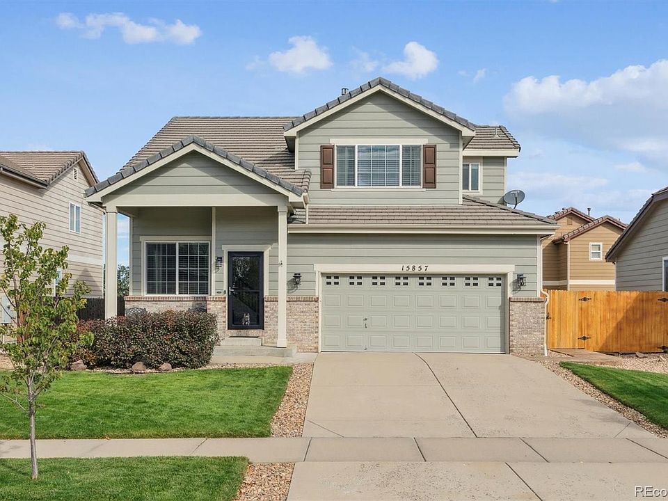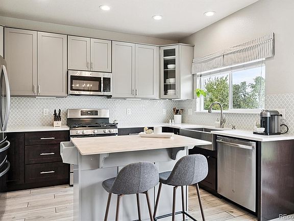 From the moment you step onto the charming front porch, this home invites you in with warmth, comfort, and modern style. Inside, gleaming hardwood floors flow throughout the main level, leading to a bright living room with soaring two-story ceilings that create an open, airy feel. The renovated kitchen is a true showpiece—featuring a moveable island, quartz countertops, stylish backsplash, sleek 42-inch cabinetry, a farmhouse sink, stainless appliances including a gas range, refrigerator, and pantry. The adjacent family room has been transformed into an inviting dining space with a cozy gas fireplace and custom built-in bookcase—perfect for gathering with family and friends. Upstairs, the spacious primary suite feels like a retreat, complete with a walk-in closet and a stunning remodeled ensuite bath with modern finishes, a walk-in shower, and a barn door that adds a touch of character. Two additional bedrooms—one with a walk-in closet—along with a convenient upstairs laundry (washer and dryer included) make everyday living easy. The 2¼-car garage offers plenty of room for vehicles, a workbench, and extra storage, while the unfinished basement is ready for your creative vision—whether that’s a home theater, gym, or extra living space. Step outside to a backyard oasis with a stamped concrete patio surrounded by trees and colorful plantings—ideal for morning coffee, evening barbecues, or simply relaxing under Colorado skies. This home beautifully blends charm, function, and fresh design—ready for you to move right in and make it your own.