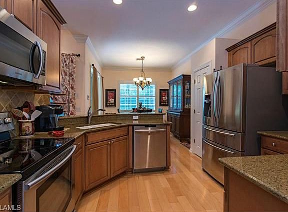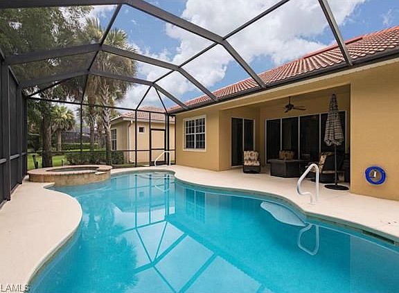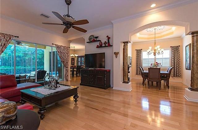 H.8549 - Totally upgraded "Marina" floor plan with heated pool and spa in a most private setting. Interior features include wide plank wood floors throughout, granite tops and rich wood cabinetry, custom window treatments including plantation shutters, crown molding, new Samsung stainless steel appliances and Duet washer & dryer, energy efficient HVAC, even garage storage built-ins, to name a few. High ceilings and the seamless flow of the great room design give the home a light and bright feel. Beautiful tray ceilings with faux finishes and elegant mural detail. Freshly painted inside and out making this home absolutely move-in ready. Built in 2005 with hurricane protection all around. The guard gated community of Delasol is a low-density, single family home-only neighborhood with shared clubhouse/pool/tennis/fitness amenities, yet low HOA fees. Conveniently located west of I-75 in North Naples, within minutes to the white sand beaches along the Gulf of Mexico, excellent dining and shopping choices at Mercato and Waterside Shops, and sun and fun at North Collier Regional Park, home to the children's museum and water park.