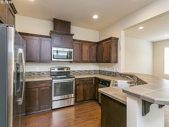 Quality built townhome that has never been lived in! Spacious 4 bed 2.1 bath with great master suite with double sinks and soaking tub & separate shower. Open floor plan with Wood laminate flooring downstairs in kitchen & entry, with carpeted family room. Stainless steel appliances, tile counters and gorgeous back splash compliment the dark cabinets. High ceilings allow natural light. Blinds already here, upstairs laundry w washer/dryer