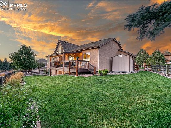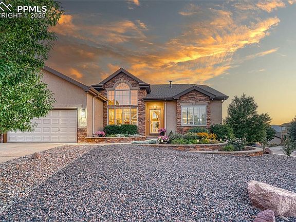 Gorgeous remodeled rancher in Jackson Creek on 1/4 acre corner lot backing to walking trails. Great curb appeal featuring custom stucco, stone, and zero scape landscape w/ colorful perennials. Open floor plan w/ real hardwood flooring recently re-finished, newer carpet, vaulted ceilings, formal dining, office w/ French doors, custom plantation shutters, stone facade wall, and gas fireplace. Gorgeous remodeled eat in kitchen w/ solid wood cabinets w/ silver hardware & crown moulding, glass tile backsplash, granite countertops, and newer SS appliances. Master suite is has high ceilings, newer carpet, and plantation shutters. Newly remodeled master bath is a spa featuring all new tile, frameless glass walk in shower w/ custom stone tile work, rain shower head, new lighting, framed mirror, granite counters, & huge walk in closet w/ built ins. Main level laundry w/ sink, window, and cabinets. Large garden level basement with daylight windows, high ceilings, wet bar, stone fireplace, surround sound, large storage room, and three additional bedrooms and full bath. New addition in 2015 of trex deck & roof is stunning. Backyard is perfect w/ lush grass, shrubs & trees, fencing w/ side gate, newer shed, stone wall, and backs to walking trail. New roof in 2024. New water heater in 2018. New windows Master bed in 2019. Rare and uncommon pride of ownership! Nothing overlooked!