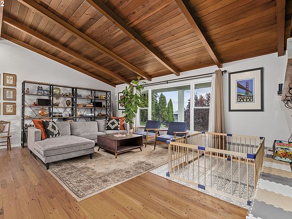 Mountain views & Mid-Century features. Vaulted wood ceilings, exposed beams, custom pegged oak floors, & solid wood doors. Two brick fireplaces. Lower-level w/ vintage bar, bedroom, & full bath. (Separate living space?) New roof & panel (2018), paint in & out (2021), flooring on the lower level, & kitchen facelift w/ butcherblock counters, sage cabinets, new sink & hardware. Private, fenced backyard, w/ covered patio & gas line for your grill! Extra deep garage with storage room. Pre-inspected. [Home Energy Score = 2. HES Report at https://rpt.greenbuildingregistry.com/hes/OR10012646]