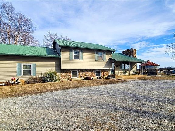 Nestled on 23.05 acres of sprawling countryside, this split-level farmhouse exudes rustic charm! The property feels like home, with an inviting aura that makes you want to sit and stay awhile. Boasting multiple living and entertainment spaces both inside and out, the owners built with family and friends in mind. Offering 3 bedrooms and 2 bathrooms housed throughout the 2,858 SF, there is ample room to spread out, and plenty of room to come together. Step inside, and you'll discover a meticulously maintained interior boasting custom features that reflect attention to detail, creativity, and craftsmanship. The staircase handrail, welded by the current homeowner, serves as a unique centerpiece, as does the main level floor that uniquely combines bricks and salvaged barn wood. Two fireplaces, with striking rock surrounds, create cozy gathering spots for chilly evenings and contribute to the warm ambiance of the home. Outside, the property is surrounded by the tranquility of the open countryside. A shop and a barn provide functional room for storage, or to work on hobbies or projects. The shop features a 2-car lean-to, a spacious 32x40 workshop area, and a built-on greenhouse that allows for year-round gardening and cultivation of plants. The 40'x40' barn has a partial concrete floor/shop area and is also equipped with 6 horse stalls, 3 of which have turn-outs, and covered shelter - perfect for a small herd, a few horses, or 4H animals. There are 3 lots and pens, providing the perfect spot for an arena, while the rest of the ground is pasture. There are also two stocked ponds. Nearby, a stamped concrete pathway leads to a grain bin gazebo, offering a picturesque spot for outdoor relaxation. Whether you're seeking a peaceful country retreat, a property that allows you to live and work in the space, a wonderful setting to grow a family - or all of the above - this well-loved and well-maintained farmhouse offers a perfect blend of comfort, functionality, and character.