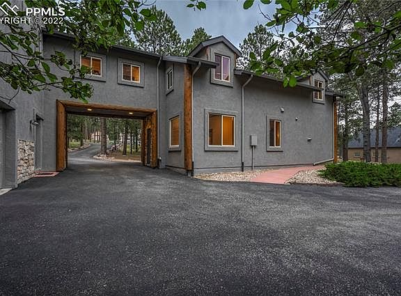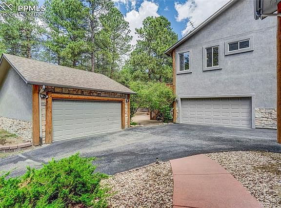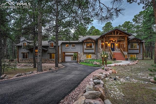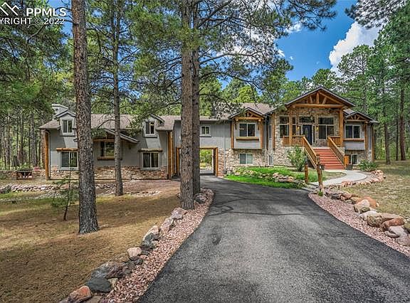 Magnificent custom Colorado mountain style raised rancher w/ guest home perched on over 3 acres of towering pines in the highly coveted and gated community of High Forest Ranch! The exterior of the home is a gorgeous mixture of stone, log beams and stucco. Four car garage. The interior of the home is bright and open w/ huge windows, vaulted log beamed ceilings, log accents, gleaming hardwood floors, 4 fireplaces and a walk-out basement. Expansive main level master suite with double sided gas fireplace, 7x19 walk-in closet, over-sized shower, double vanity, stone accents, architectural niches and a large jetted tub. Great room with soaring wood beamed ceilings, double sided gas fireplace with stone surround. Spacious kitchen with island, stainless steel appliances, custom hood, pantry, hardwood floors, dining area and a walk-out to the back deck. Fully finished basement with a huge family room, walk-out to the lower level outdoor entertaining space, fireplace, a wet bar, two huge bedrooms, a jack & jill bath and a concrete enclosed safe room area/storage. The guest house is attached to the main house by a walk-way but with no touching walls and has a private entrance, three bedrooms, 3/4 bath, living room w/ fireplace and stacked stone, Brazilian cherry hardwood floors, kitchenette, pantry, separate laundry and a walk-out to the private patio. Well mitigated beautiful grounds with mature pines and tons of outdoor entertaining areas. Large deck that walks out from the main level overlooking your private forest of mature pines. Huge paver patio off of the walk-out lower level. Two car attached garage and two car detached garage. FTTH (Fiber to the Home) High-speed Internet access. The sought after gated community of High Forest ranch offers trails, ponds, community club house and multiple gated access points. Amazing access to Highway 83, I-25, The Air Force Academy and the amenities of Northgate and Monument. Easy commute to Colorado Springs or Denver.