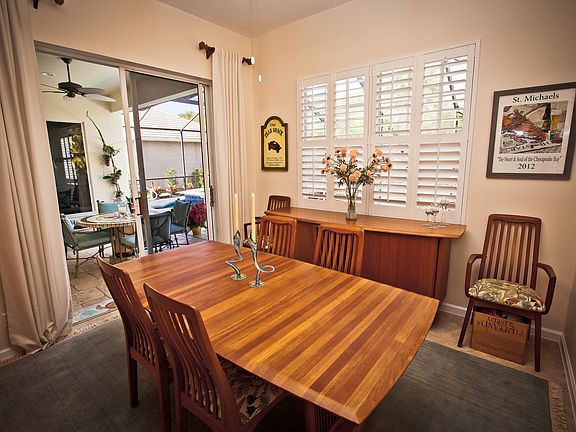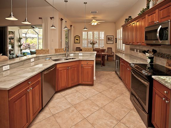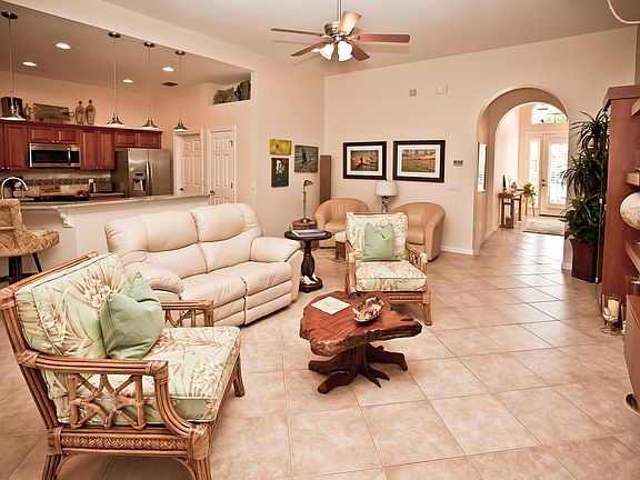 H.11744 - Packed with upgrades and wide open great room floor plan is simply irresistible. The designer finishes are perfect and delightful. The great room has a custom California Closets design with floating shelves, lighted curio and entertainment center with plenty of room for your supersized TV. Ample space affords a comfortable seating grouping and is open to the kitchen, so even the cook can participate in the family's conversation. The custom granite and warm kitchen cabinetry are plentiful and the stainless steel appliances add to the overall modern feel. There is a built-in dual temp. wine cooler close to the dining area for easy access. The master suite is tastefully done with today's colors and has 2 large walk-in closets and a luxurious bath. The 2 guest bedrooms share a remodeled bath. Out on the lanai, relax around the lovely pool and spill-over spa with its private tropical oasis. There is a wall mounted control panel for the pool and spa. Bring your glass of wine out and enjoy beautiful Florida evenings. Pool gets full sun while covered area lets you sit out all year. The 2 car garage is clean and well kept with top of the line epoxy coated garage floor.