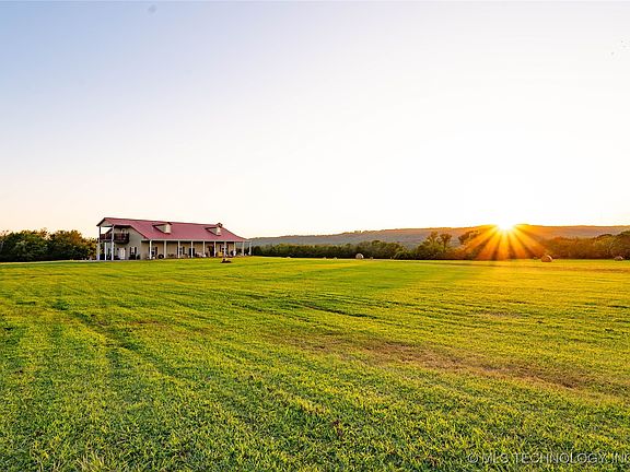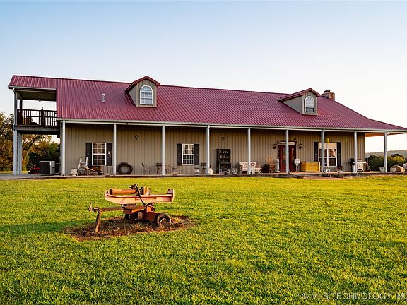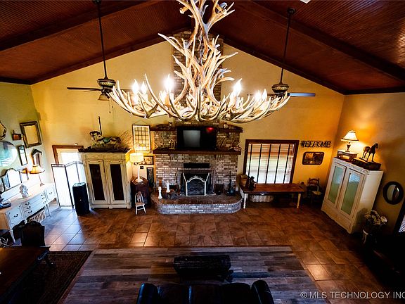 Motivated Seller! This custom built home is everything you are looking for and more. Views of Henryetta Lake from 3 sides, and approximately 60 Acres of Prime Acreage. Wrap Around Covered Porch, Great Room with stunning 5 Ft real Antler Chandelier, 26 ft m/l vaulted and beaded ceiling, floor to ceiling brick wood burning fireplace, Lovely Kitchen, w/antique ceiling tiles, one of a kind custom cabinetry and vent hood, appliances and marble topped island and counters. 3 bedrooms and full bath downstairs, along with laundry room w/washer & dryer and built in cabinetry, upper level has a custom built Tri-level staircase, landing and a very spacious primary bedroom w/walk in closet, balcony overlooking acreage and a beautiful full bath. There is a Ranch (Guest) House on the property w/full bath, kitchen area, living area, 2 car garage and covered porch. The Workshop and Custom Kennel has a covered porch, 1/2 bath w/living/office area including a laundry area, overhead door, and spacious enough for hobbies of almost any kind, the interior part of kennel has 8 runs to outdoor concrete area w/water and drainage. Large Pond, w/dock that needs repair, fenced, wooded and cleared acreage. Henryetta Lake is just across the road, boating, swimming and fishing. This home was crafted with one of a kind, and unique pieces that will charm you. Looking for a hunting retreat, raise some livestock, or a life in the country, this is the place for you. Property is conveniently located just off Hwy 75, I-40, Hwy 169, Approx 45 mins to Tulsa, OKC, McAlester and easy travel to Texas, Arkansas, Missouri, Kansas and More.