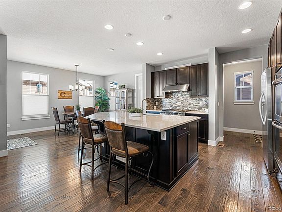 The main level features an executive office with French doors plus huge windows for afternoon sun. Spacious dining room flows to kitchen with quartz countertops, loads of cabinets, glass tiled backsplash, SS appliances, large island with sink, and an enormous walk-in pantry. Walk out to the back covered deck for easy barbeques or just watching the sunset. Fenced backyard beautifully landscaped with trees & large flagstone patio with privacy screens, perfect for festive gatherings w friends.