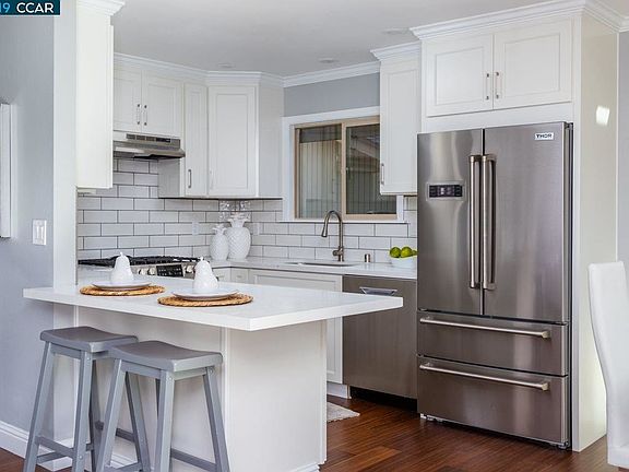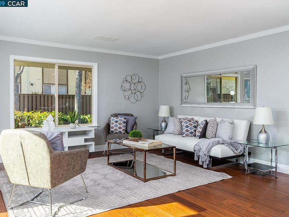 WOW FACTOR PLUS HERE! PROFESSIONALLY REDESIGNED SINGLE STORY CORNER UNIT OFFERS OPEN CONCEPT FLOOR PLAN AND STYLISHLY SELECTED UPGRADES! ALL NEW KITCHEN with full tile back splash over quartz counters, stainless steel appliances include gas range/oven, recessed lighting and extended breakfast counter. Kitchen wall removed opens to living and dining area with gas burning fireplace, crown moldings, wide baseboards and sliding door to spacious private patio. ALL NEW MASTER BATH with expanded 5 ft walk-in shower and remodeled secondary full bath. New paint, popcorn ceilings removed, dual pane windows, two enclosed patios and an OVERSIZE 2 CAR GARAGE with lots of room for extra storage! Great Walnut Creek location near BART, Shopping, and Hiking/Biking Trails. No rental restrictions! RARE OPPORTUNITY TO OWN THIS ONE OF A KIND UNIT! Open house Sat 01-26 and Sun 01-27 1:00 to 4:00