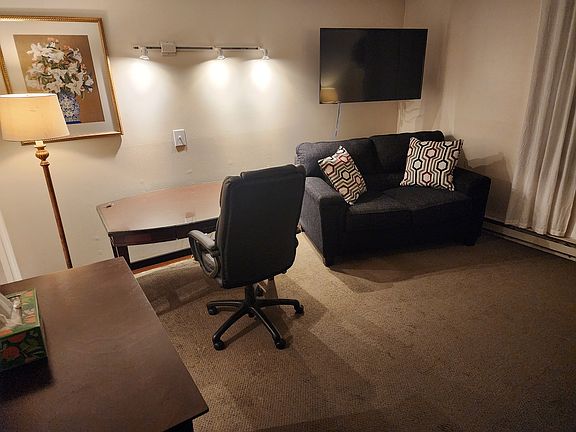 A furnished studio apartment is available for flexible personal or business living arrangements....but affordable. The unit has wonderful lighting, wall to wall carpet, kitchen appliances (stove, hood, fridge and microwave), television and air conditioner. The unit includes a king size bed with bedding, night stands, dresser, armoire, desk with chair, lamps, dishes, pans, silver ware, extra blankets, bath towels etc. The apartment has all the comforts of home. Utility expenses including high speed internet are covered by the landlord. The property can be reached for the Mass Pike Exit 8 toll booth in 3 minutes. There are 3 restaurants within a block. The central business district is a five minute walk to the east. Palmer boasts a wonderful state of the art library .a short walk to the east!
