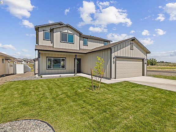 LOT:TE32 - MOVE-IN READY!!! - This exquisite brand new 2373 SQFT two level modern farmhouse offers the perfect blend of contemporary design and comfortable living. 4 bedroom 2.5 baths with luxurious main level primary suite with double sinks, shower, freestanding soaking tub, and large walk-in closet. Deluxe chef's kitchen with quartz counters, 36" upper cabinets, walk-in pantry, island, farm sink, and stainless steel appliances including gas range and dishwasher. The Thielsen plan in the desirable Cimmaron Terrace neighborhood in Hermiston OR. Built by award winning builder MonteVista Homes. Open concept living, 9ft ceilings, great room, spacious loft, 95% high efficiency gas forced air heating, air conditioning, dedicated laundry room, gas fireplace, RV parking, and covered patio.