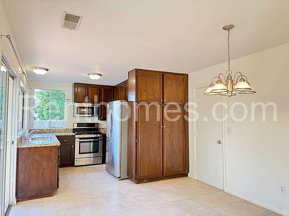 Welcome to 1588 Rambla Puesta, a beautifully remodeled home nestled in the heart of San Marcos, CA. This single-level home boasts a great cu-de-sac location, four spacious bedrooms, two full bathrooms, and a two-car garage with an automatic opener. The interior features a neutral decor, vaulted ceilings in the living room, and upgraded travertine tile floors in the entry, kitchen, dining room, and bathrooms. The kitchen is a chef's dream with sparkling granite counters, stainless steel appliances, and an eat-in area for casual dining. The primary bedroom offers a spacious walk-in closet and a slider to the fenced rear yard. All four bedrooms have ceiling fans with light fixtures. The hall bathroom offers a tub/shower combo. The home also includes a gas log fireplace, central heating, and air conditioning for year-round comfort. Outside, enjoy the lovely paver tiled patio and automatic sprinklers. This home is conveniently located close to shopping, schools, and a large community park. Small pets under 25lbs are considered. A gardener is included, and washer/dryer hookups are available for your convenience. Experience the best of San Marcos living at 1588 Rambla Puesta.