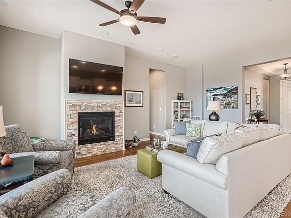 Come see this gorgeous Toll Brothers Home Carson model home, corner lot, extra light and windows with a perfect open floorpan. This home boasts a plethora of upgrades including gourmet kitchen with large island perfect for entertaining. French country cabinets, rollouts, backsplash, upgraded stainless appliances and solid surface countertops. Professionally landscaped lot, easy to maintain with much of it xeriscaped. Covered back deck great for entertaining, 2 bedrooms plus flex space for an office, craft room or extra den. Over 1700 sq ft, this home has a large primary bedroom with upgraded flooring, carpets, and window coverings. Large bathroom with European Framless shower, 2 sinks and large walk in closet. 2nd bedroom is on the front side of the home giving you lots of privacy and has a full bath. A nice mudroom with bench, cubbies and washer and dryer included. Larger garage with 450 sq ft and tall ceilings for storage. This home has upgraded lighting, electrical and tall ceilings giving it a feeling of grandeur. Surround sound and speakers, stacked stone cozy gas fireplace. Solid extended wood flooring and external garage key pad included. Located in Colorado’s premier 55 plus community with a 30 sq ft recreation center with fitness indoor/outdoor pool, indoor/outdoor hot tub and over 130 clubs. Over 40 miles of walking and biking trails surround the neighborhood. Close to shopping, restaurants, Denver, Boulder and DIA. This one won’t last. Come take a look.