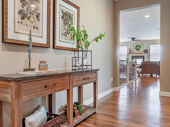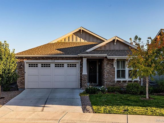 Main-floor living at its finest, this stunning patio home features 3 bedrooms plus an office, 3 bathrooms, finished basement, and unobstructed views of the mountains and serene open space all from your back patio. With upgrades galore including custom shutters and Hunter Douglas window treatments, classic iron stair balusters, oversized 2 car garage and stylish finishes throughout. Upon entry, you are greeted by stunning hickory hardwood flooring. Boundless windows boast plenty of natural sunlight throughout the spacious main level giving the 10ft ceilings an airy and comfortable feel. The open living area flows seamlessly between the dining space, living room and kitchen. This luxurious kitchen design comes with quartz and granite countertops, modern appliances, gas cook-top, subway tile, two tone cabinets and ample pantry storage. The tranquil primary suite has a large walk-in closet with a custom closet system and an en-suite bath with double sinks and a sleek seamless shower. Additional bedroom, full bathroom and a study with glass french doors round out the main level. The finished basement provides bonus space for an in-home theater, built-in wet bar, space for an in-home gym and don’t miss the huge storage room. Your guests will have their own private bedroom suite with a full bathroom. Retreat to the low maintenance beautifully landscaped yard with a covered patio, gas fireplace, fire-pit and concrete paver patio. Enjoy dining and relaxing al fresco with views galore. With easy access to I-25 and E-470 this community features a 5-acre park and miles of biking and walking trails.
