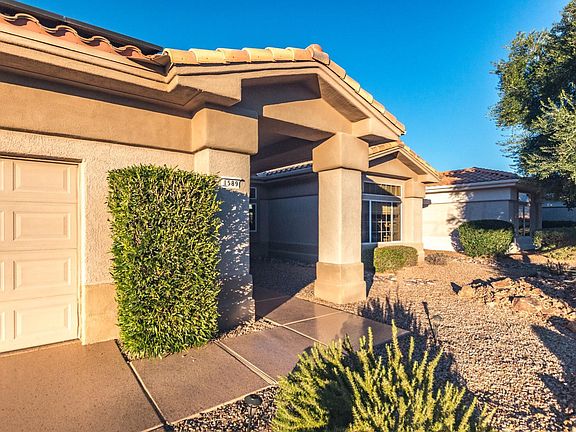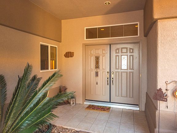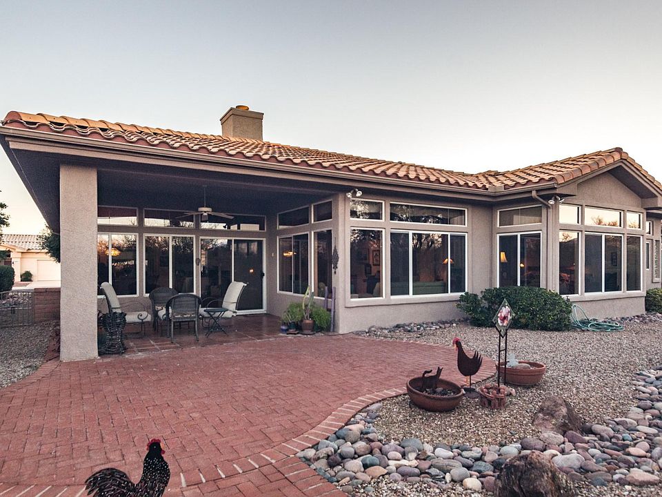 A most unique opportunity! A Crestview model with an additional third bedroom/office is complete with glass pane french doors. Fabulous window line view of the desert vista. Every room is bright and airy with high ceilings. Gourmet granite kitchen island and counters. Extra closets in entry hall and master suite. Gas fueled fireplace with ceramic logs in the Arizona room. Covered patio with exterior fan, and brick paved patio extension. The huge backyard borders the desert corridor, and is retro fitted w/electrical & plumbing for in-ground fountain. No rear neighbor provides tranquility & privacy. Additionally there is an interior laundry room w/ service sink, cabinets & folding counter. Built-in closets and work bench in the garage. Sellers have done a pre-salehome inspection.
