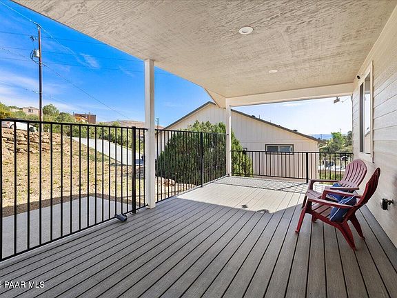 Set back from the street in a corner of Diamond Valley, this 2023-built home offers the perfect blend of privacy, modern comfort, and inspiring views from both the front and back. A charming covered front porch invites you to relax with your morning coffee while soaking in the peaceful surroundings and scenic neighborhood backdrop. The exterior's thoughtful placement not only maximizes privacy but also captures the views of the Mingus Mountains. Step inside to find a beautifully designed interior, where custom touches and a warm, welcoming atmosphere greet you at every turn. The spacious great room features soaring ceilings, an abundance of natural light, and wood-look luxury vinyl flooring that flows seamlessly throughout the main living areas, creating a cohesive and stylish foundation.The open-concept kitchen is a showstopper, complete with a large butcher block island, eye-catching dual-tone cabinetry, quartz countertops, and sleek stainless steel appliances, including a smooth-top electric range with convection oven, perfect for everyday living and entertaining alike.The primary suite is both inviting and refined, highlighted by a striking shiplap accent wall. The ensuite bathroom offers dual quartz-topped vanities, a separate walk-in shower, soaking tub, and a generous walk-in closet. The two additional bedrooms are filled with light from windows on two sides and each includes a ceiling fan for year-round comfort. These bedrooms share a well-appointed hall bath with a tub/shower combination.Just off the kitchen, the laundry room doubles as a mudroom from the attached 2-car garage and includes a linen closet for added functionality. Step out back to discover a spacious deck with unobstructed mountain views and a seasonal creek below, creating a picturesque and peaceful retreat. For added convenience, there's ample storage space beneath the home, offering room for tools, seasonal items, or future creative use. This home is truly a rare gem in a sought-after location.