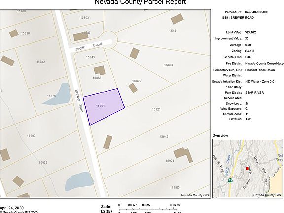 This level lot provides more than a half an acre of space to plan your future yard and house site. It’s located in the Alta Sierra Subdivision and is ready for your future cabin or retirement home! With areas providing tree cover and other areas already cleared, there’s plenty of opportunity for privacy and open spaces for ease of building. There’s a small creek running through the property giving the relaxing sounds of flowing water while relaxing under the shade of multiple mature trees! Paved roads, water, electricity, and internet all available for the future owner of this buildable lot. Priced under market value for a quick sale! Call us today! Alta Sierra Country Club= 2 min Grass Valley, CA = 15 min Auburn, CA = 30 min Yuba City, CA = 1 hr Sacramento, CA = 1 hr Lake Tahoe = 2 hr Cash Price: $19,900 Acres: 0.66 County: Nevada State: California APN: 24-340-06 GPS (center of lot): 39.127141, -121.042791 Address: 15891 Brewer Rd, Grass Valley, CA 95949 Legal Description: Lot 48 ALTA SIERRA ESTS #15A Elevation: 1,750 Power: Yes Water: Yes Phone: Yes Sewer: Septic to be installed by buyer Roads: Paved Zoning: Residential – Vacant Land Title Info: Clear Title (Purchased with title insurance) Property Tax: $375.72 *Note: Buyer to verify all information.