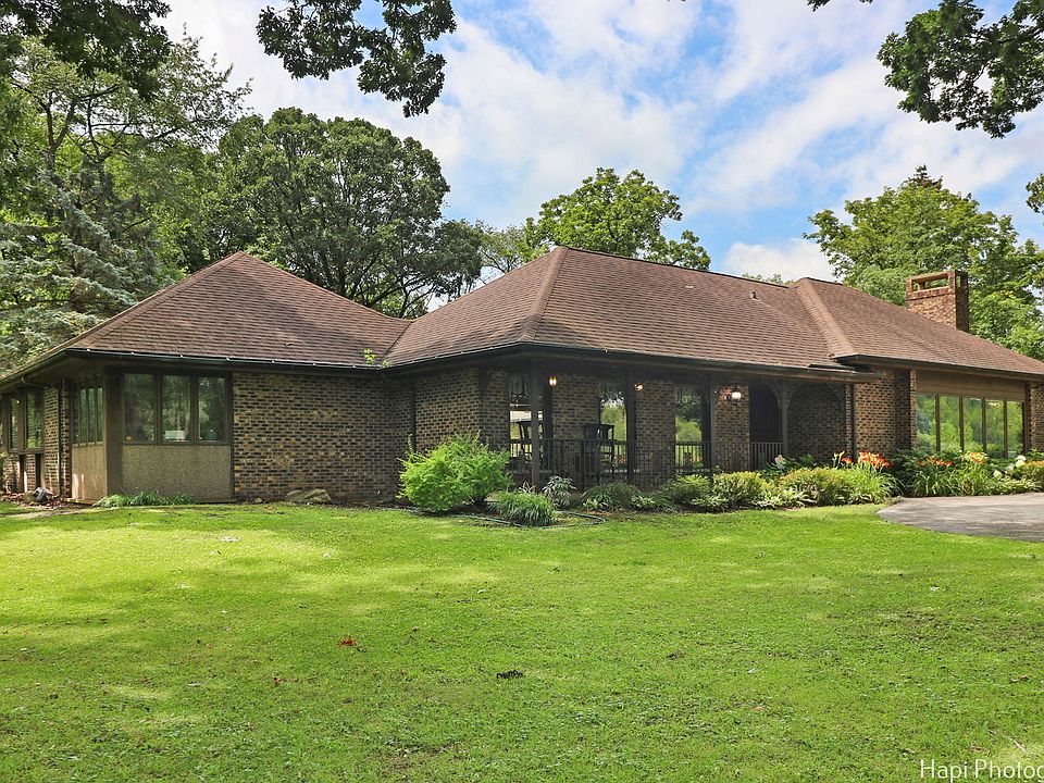 Welcome to this Barrington Hills gem! This prime real estate consists of 15 sprawling wooded acres of 3 parcels (aerial photo shows dimensions of all three parcels). When you enter through the stately iron gate, you'll discover a picturesque retreat with majestic mature trees, plus apple, mulberry, and black walnut trees dotting the landscape. The main residence is a charming 4-bedroom, 2-bathroom ranch-style home featuring a heated attached 3-car garage and potential for expansions. Inside, you'll find a spacious remodeled kitchen with dining area, granite countertops and stainless steel appliances. You'll find beautiful hardwood and stone floors throughout the home. The sunken living room and family room with a cozy fireplace provide ample space for relaxation. The laundry/mud room is conveniently situated adjacent to the garage. In addition to the expansive property for home additions, the full unfinished basement promises further customizable living space. Outdoor amenities include a front porch, back patio, and a greenhouse, perfect for enjoying the serene surroundings. A highlight is the expansive 2100+ sq. ft. heated barn with a concrete floor and a 16-foot high door, ideal for storage of vehicles, boats, or as a space for horses to enjoy your nearby riding trails and Barrington Hills equestrian activities. The home is serviced by all-electric HVAC with 400+ AMP service, and features updated furnaces, water heater, kitchen, and bathrooms. Located in the highly acclaimed District 220 Barrington schools, with elementary school bus service right to the door and end of driveway for middle and high schools. Conveniently situated for shopping, dining, entertainment, and commuting options via Metra train and highways, this property offers a blend of tranquility and accessibility, making it an ideal choice for creating your dream home. Must see!