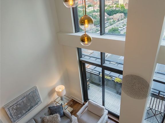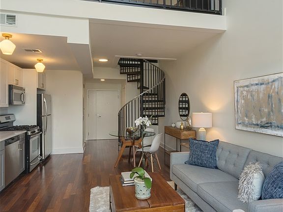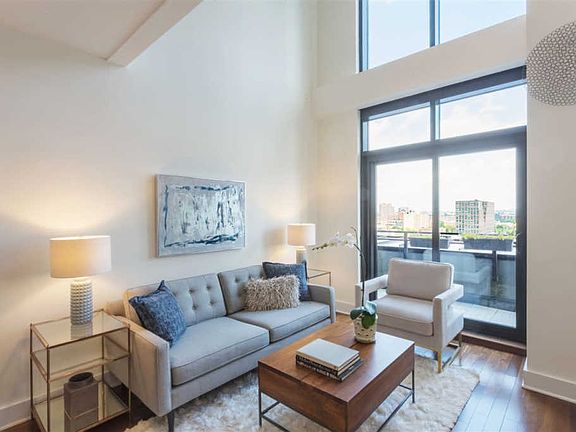 This penthouse, loft-style 1 bedroom, 2 bath is the epitome of industrial-modern elegance and sophistication. The main living spaceâs most prominent feature is its soaring 20â ceilings and wall of windows that makes the space feel even more voluminous.  Whether from the living room or from your own private terrace, you can enjoy views of the city to the west, north and east. The feeling of this space is decidedly an industrial-chic vibe with two-toned kitchen cabinets,  stainless appliances, quartz countertops & satin brass accents, representing the best of todayâs design trends.  The first floor is a perfect entertainment space with areas for dining, lounging and cooking along with a full bathroom. Heading up the steel spiral staircase is the bedroom and ensuite bathroom, which maintains direct site-lines to the open city views. Other key features of the home include in-unit washer/dryer, central air & walnut hardwood floors. Waldo Lofts is located in the Powerhouse Arts District, just 3 blocks away from the Grove street PATH and a multitude of shops, restaurants & other public transportation options.