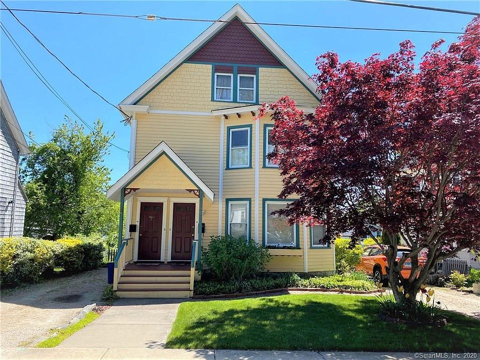 Storybook 2 Family duplex with two driveways is accessible immediately for occupancy. Refreshingly move in condition in both living units offering handsome shiny wood floors, three sets of front windows bring in brilliant natural light and large Dining rooms for ample size tables. Both units have a side bedroom and a larger back bedroom. Ceiling fans have been added to several rooms. The upper unit boosts a beautifully renovated kitchen complete with new Kraftmaid wood cabinets, granite counters, porcelain tile floor, not to miss is the tumbled onyx stone back-splash, a vented hood and stainless steel appliances. There is a door that leads out to the upper deck which overlooks the large backyard. The first floor unit also has an updated kitchen with white cabinets, black counters, tiled floor and a laundry area off the kitchen. The first floor unit offers a stylish tiled shower and tiled floor. Updates to note are the newer roof replaced in 2015, vinyl siding added to the east side, new ceder clapboard added in 2018, sections with new gutters, one new oil tank. Take a short stroll to the waterfront or to the City parks.