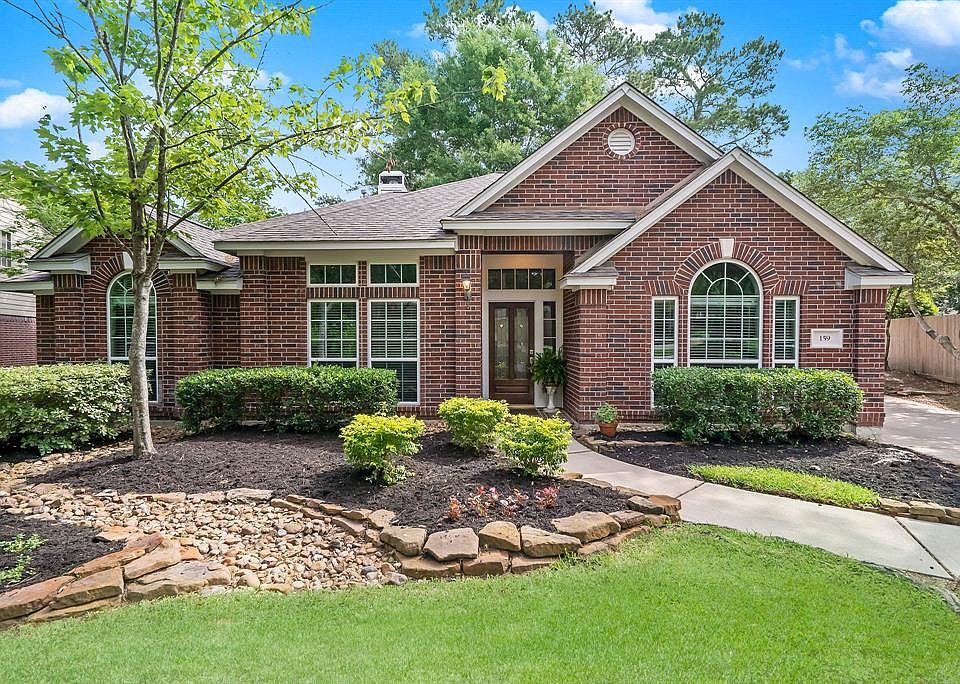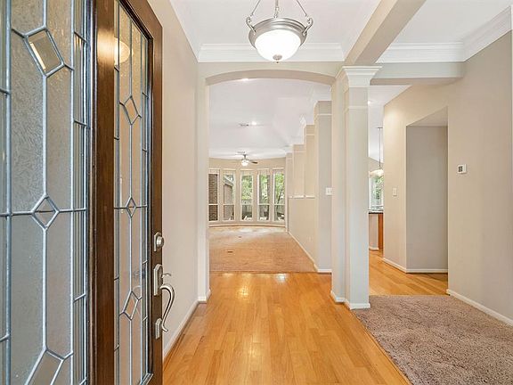 Virtually staged photos of a possible remodel idea with hardwood floors and painted kitchen cabinets. Over $60K in improvements and upgrades including master bath remodel, recently installed two new HVAC units, double pane windows throughout the home and new roof in 2013. This traditional single-story home that presents lush landscaping and mature trees. The open floor plan has an island kitchen, a breakfast room, a large den with built-ins, a bonus room, a spacious master suite and two sizable secondary bedrooms. Other notable features include high ceilings, crown moulding, custom built-in cabinetry, and generous sized living spaces. The kitchen offers granite counter tops, glass door cabinets, large island, and hardwood floors. The spacious master suite has high ceilings and large windows with a serene view of the outdoor area. The newly updated spa-like bath offers a stand alone soaking tub, two vanities with granite counter tops and a frameless walk-in shower.
