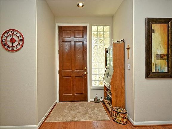Nicely maintained Angelina. Glass storm door with glass block sidelight. Wood floors, carpeted bedrooms. Open living/kitchen and dining area. Custom wood valances in living/dining areas. Tile counters in kitchen with a bay window. Master has a bay window, walk-in closet and silestone counters. Nice fenced yard with covered patio and mature trees. Tandem garage with overhead storage, water softener, attic storage and a side entrance door. New roof in 2013 & new water heater in 2015. (CAT IN THE HOUSE)