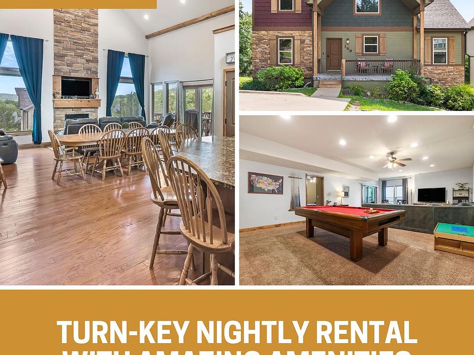 Amazing Investment Opportunity!!! Turn-key nightly vacation rental with amazing amenities: Clubhouse, two pools including zero entry pool, splash pad, and playground, walking distance to Table Rock Lake, Boat Storage while being just a mile from a public Boat launch. Minutes from Top of the Rock and Big Cedar as well as downtown Branson. Open floor plan with cathedral ceilings with custom beams, wood flooring, stone fireplace, and 2 living rooms. This home also boasts a private hot tub which can be used year round! The hot tub is located on the screened in porch, which backs up to the trees for privacy! Enjoy the indoors with an Pool table and game room in the basement!