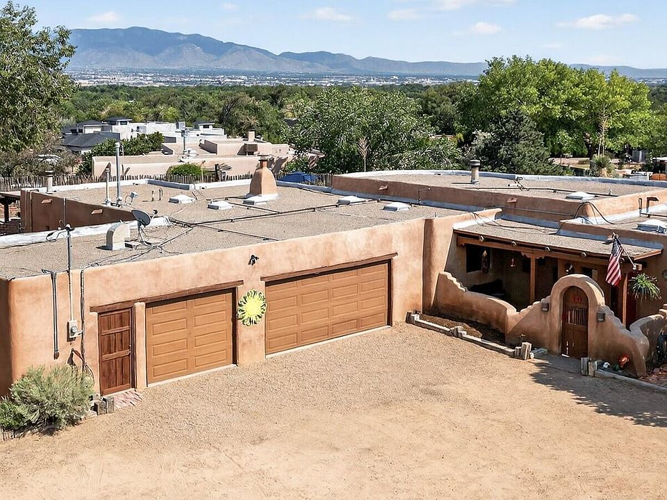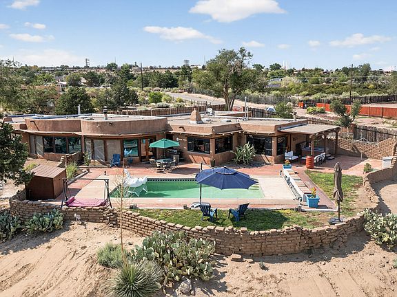 This dual-gated .94-acre estate in Corrales is a stunning Ed Paschich custom and well-maintained home, offering privacy and panoramic mountain views that dominate the day, while city lights provide a stunning nightly backdrop to your private pool and hot tub. The interior stays true to its roots with exposed adobe walls, raised latilla ceilings, and classic brick floors throughout. Recent major improvements ensure a worry-free transition: new windows and exterior doors (2023), well pump (2023), HVAC (2020), and a full-perimeter coyote fence (2019). Combining historic Southwest character with modern infrastructure, this property provides a serene sanctuary for the discerning buyer seeking beauty, security, and a deep connection to the high-desert landscape. Your own Corrales oasis awaits