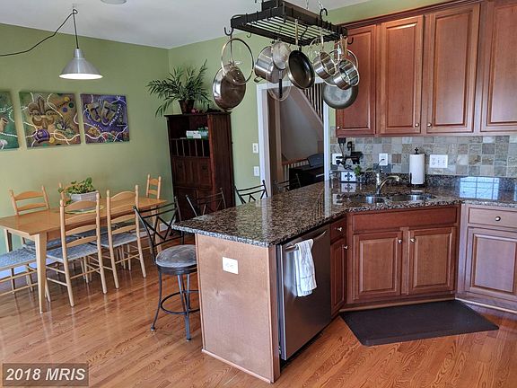 Great end unit, brick front town home w/detached garage (which gives added storage) & private courtyard. Sunny entry w/ bedroom & full bath on entry level in addition to the family room. Newer wood stairs lead up to the kitchen w/granite counters, stainless appliances including 3 door refrigerator. Recent improvements include new roof and exterior paint. One year Home Warranty! Across from park!