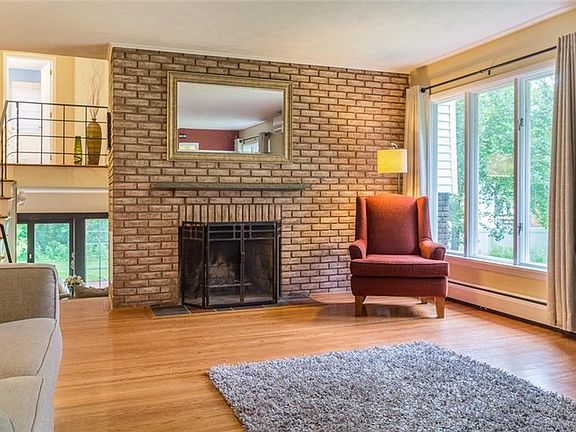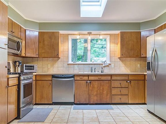 This home is BIG: over 2,400 sqft PLUS an informally fin basement! Yes, PLUS the basement. You wouldn't know it from front. The house is completely private from the street. It expands up & towards the back to give you all that living space. A formal foyer opens to a HUGE Liv Rm w newly refinished oak flrs, an impressive frplc & open thresholds into the Kit and Din Rm. Air conditioning! Kit is awesome and features mid-century inspired cabinets w tons of storage & a wonderful skylight! Step down to an enormous family room w 2nd frplc and walkout thru sliding drs to the deck! Full bedroom w private bath off the Fam Rm! 3 big bdrms & fully remodeled bath upstairs. Partially finished basement adds value! Tear-off roof. The landscaping is meticulous! This home is ready for you to move in!