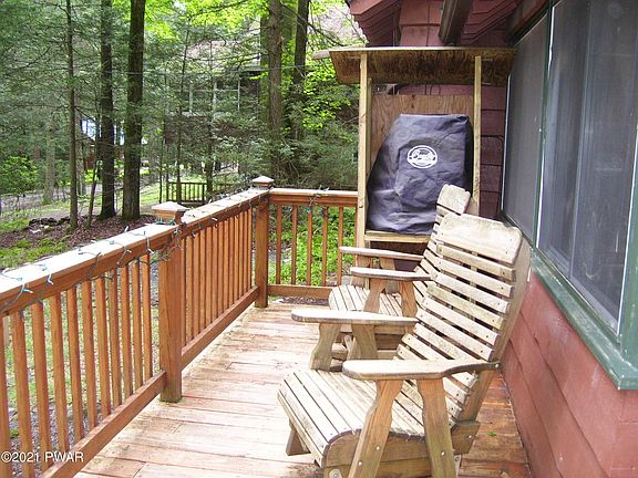 Authentic Gumble Chalet in the lake right community of Millbrook at Lake Wallenpaupack! This property features 2 bedrooms plus large sleeping loft , full bath, four Season Sunroom with a propane free standing stove, living room with Bluestone fireplace with woodburning insert, eat in kitchen with original pine cabinets and hardware, Spacious decking and landscaped outdoor patio area with firepit. A shed and large Utility Garage is perfect for your golf cart, ATV and lake toys. This property also comes with an additional lot perfect for a garage or outdoor play area. Lake rights at Lake Wallenpaupack are included and a boat slip may be rented through the Millbrook Community. Make an appointment today to view this cozy cabin in Millbrook at Lake Wallenpaupack!