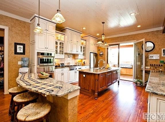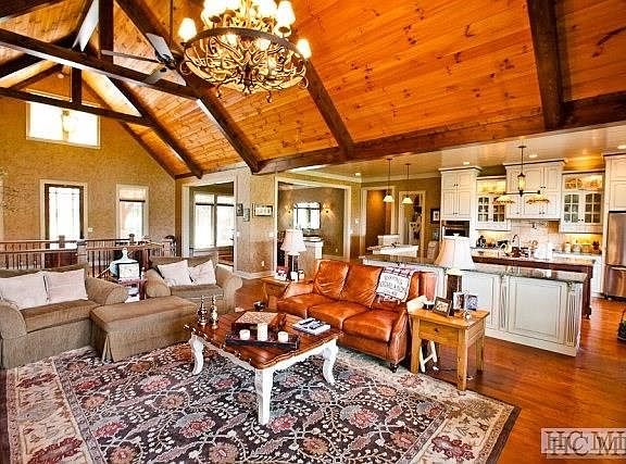 Stunning and spacious home boasts the finest quality materials and workmanship. Main level features an open, airy great room, with large custom kitchen and dining area for all of your friends and family to enjoy each others company. Huge living area with heavy beams and stone fireplace and opens to a covered porch with outdoor kitchen that boasts a great mountain view. Master suite also takes in the view with a spacious en suite with tub and walk thru shower. His/Her offices, laundry room and 2 car garage. Upper level can be bonus room or guest suite with large bath. Lower level has 3 bedrooms, family room with morning kitchen and additional 2 car garage.