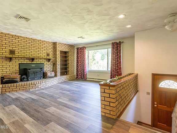 Wood burning fireplace insert in living room. Harman wood pellet stove in family room.